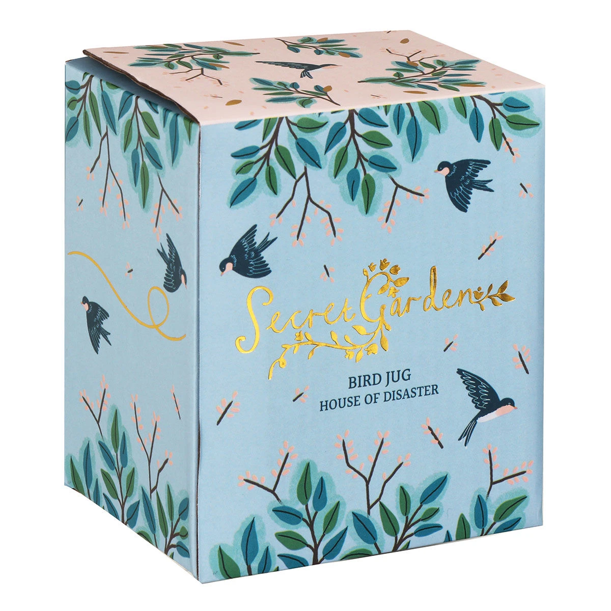 This beautiful jug is decorated with treetops make up of brown branches with foliage in shades of green and dainty peach buds, complete with the ‘Secret Garden Birds’. The design is set upon a pale blue background representing the sky which continues inside. The handle displays a 3D element featuring a single blue bird perched on top. The whole design is complete with gold highlights which creates a luxury finish to the piece.