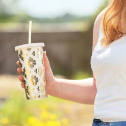 This stylish and eco-friendly water bottle features a gorgeous floral print from Joules; cream, coral and yellow wildflowers are interspersed with flecks of foliage that tumble across the transparent glass vessel.