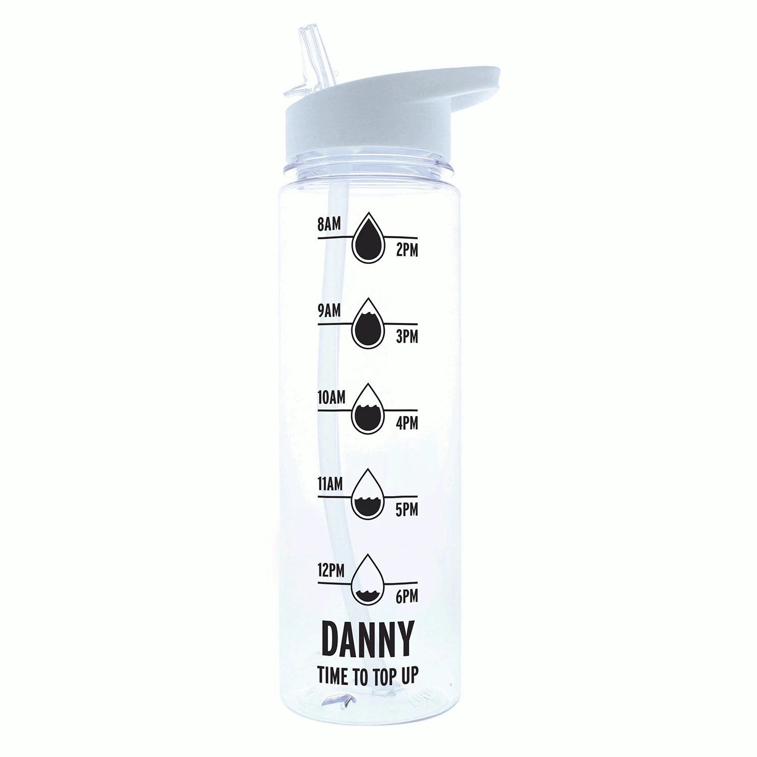 Beautifully black, this bottle has a white, twist-on lid with a clear flip top drinking spout and a hanging loop making it easy to carry wherever you’re going. The bottom of the bottle features the words ‘TIME TO TOP UP’ and can be personalised with a name of your choice to give this gift a personal touch.