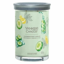 This luxurious Cucumber Mint Cooler aroma from Yankee Candle is zesty and fruity, with aromas of refreshing cucumber, lemon and mint intertwining. This Signature Large Tumbler is a sleek glass vessel with straight sides that complement the fragrance and will look wonderful in any home décor theme, perfect for any home. The candle comes with a silver metal lid that doubles as a stand to sit your candle on to protect your surfaces. This fragrance will remind you of a summer’s day in the park.