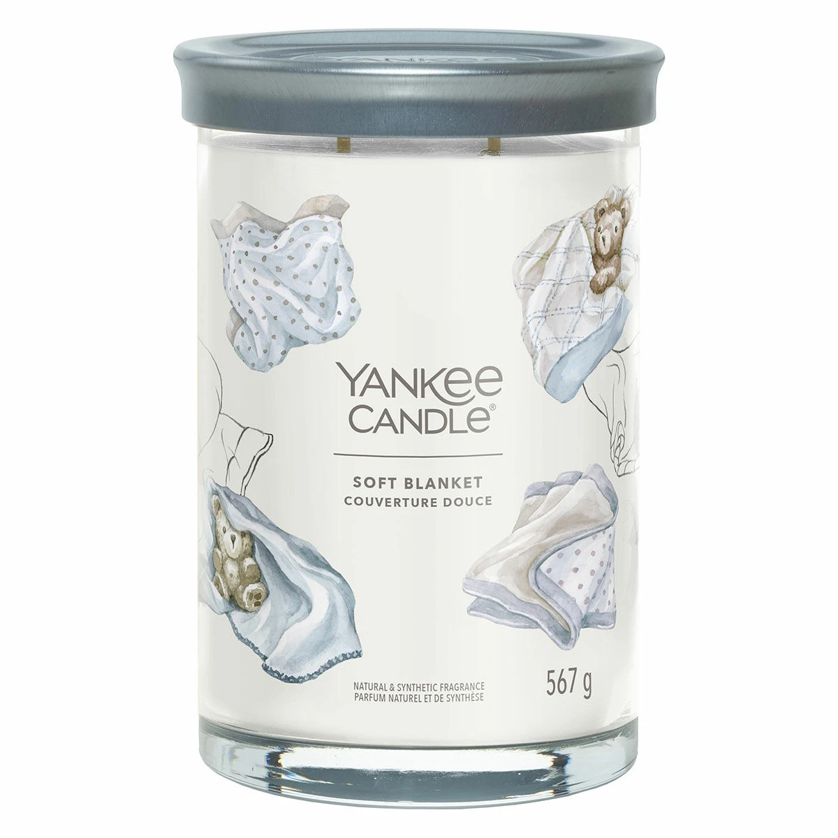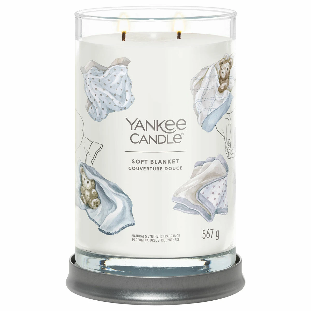 Enjoy the luxurious aroma of Soft Blanket with this wonderful Signature Large Tumbler from Yankee Candle. This candle comes in a sleek glass vessel with straight sides that complement the fragrance and will look wonderful in any home décor theme. The candle comes with a silver metal lid that doubles as a stand to sit your candle on to protect your surfaces. The aromas and notes of this scent combine to conjure a familiar and comforting feeling of freshness. It is wrapped in sweet dreams; a lullaby of clean citrus, luxurious vanilla and warm amber.